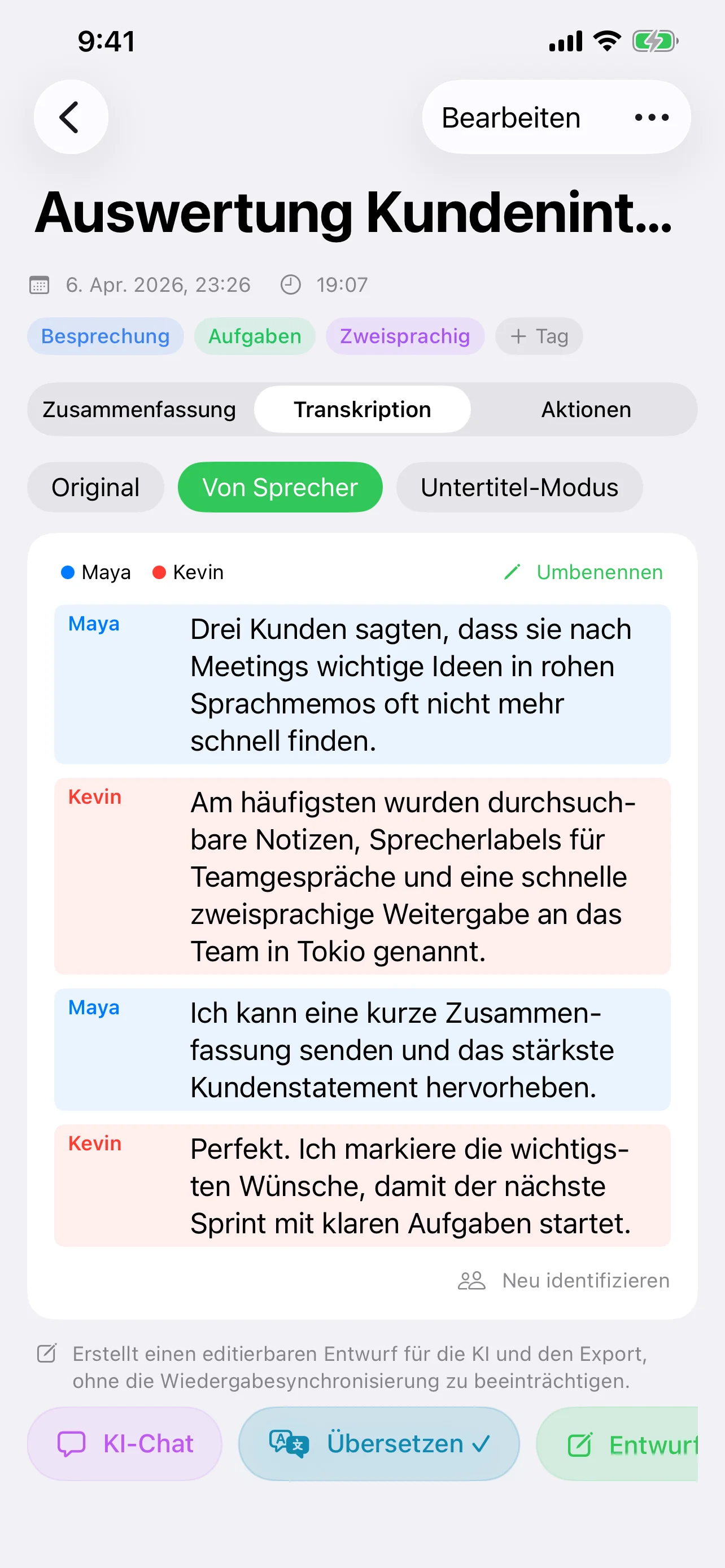 Erstelle Transkripte, sprechergetrennte Ansichten, Untertitelmodus, KI-Zusammenfassungen und Aufgaben – alles innerhalb der Notiz.