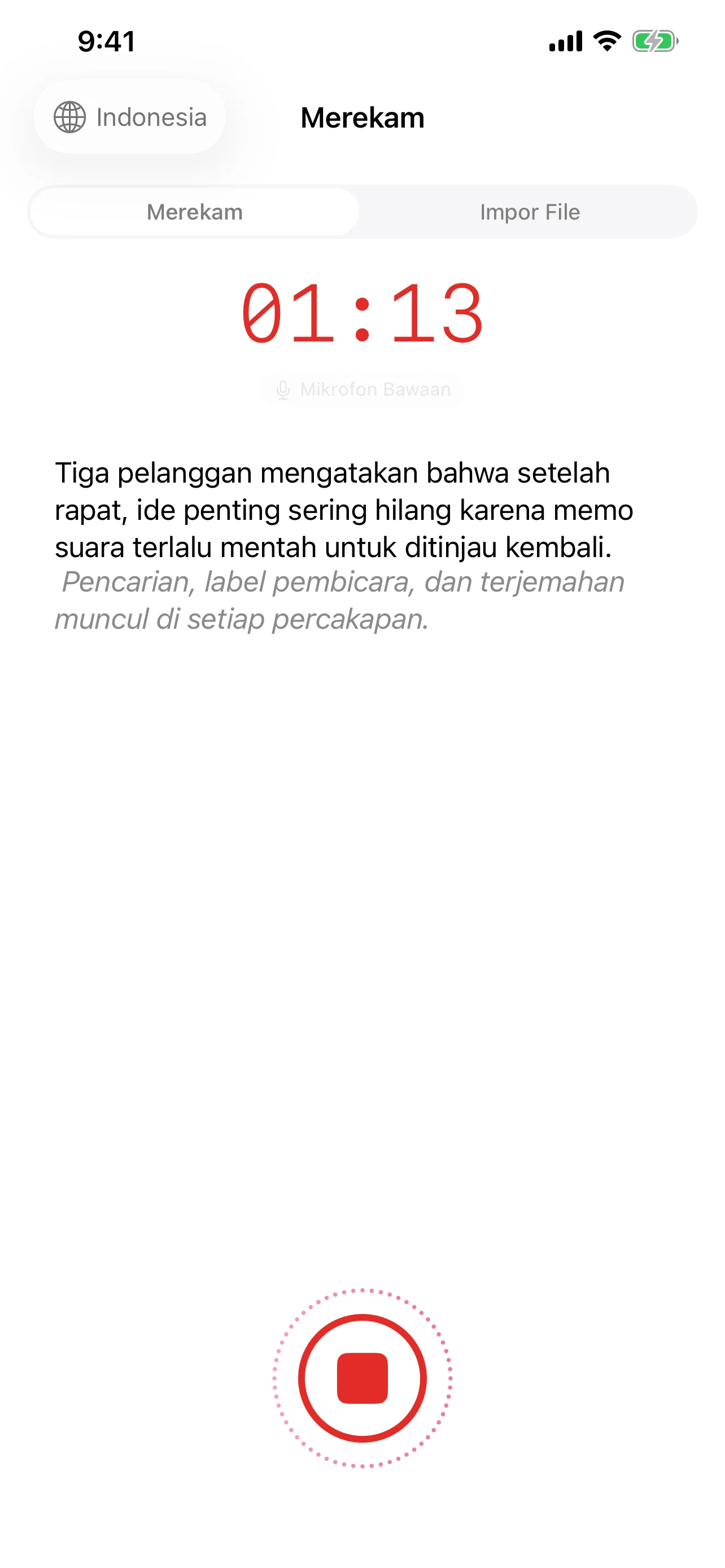 Sekali tap untuk merekam. Live Activity, Dynamic Island, widget, dan Spotlight membuat memulai dan kembali ke catatan jadi mudah.