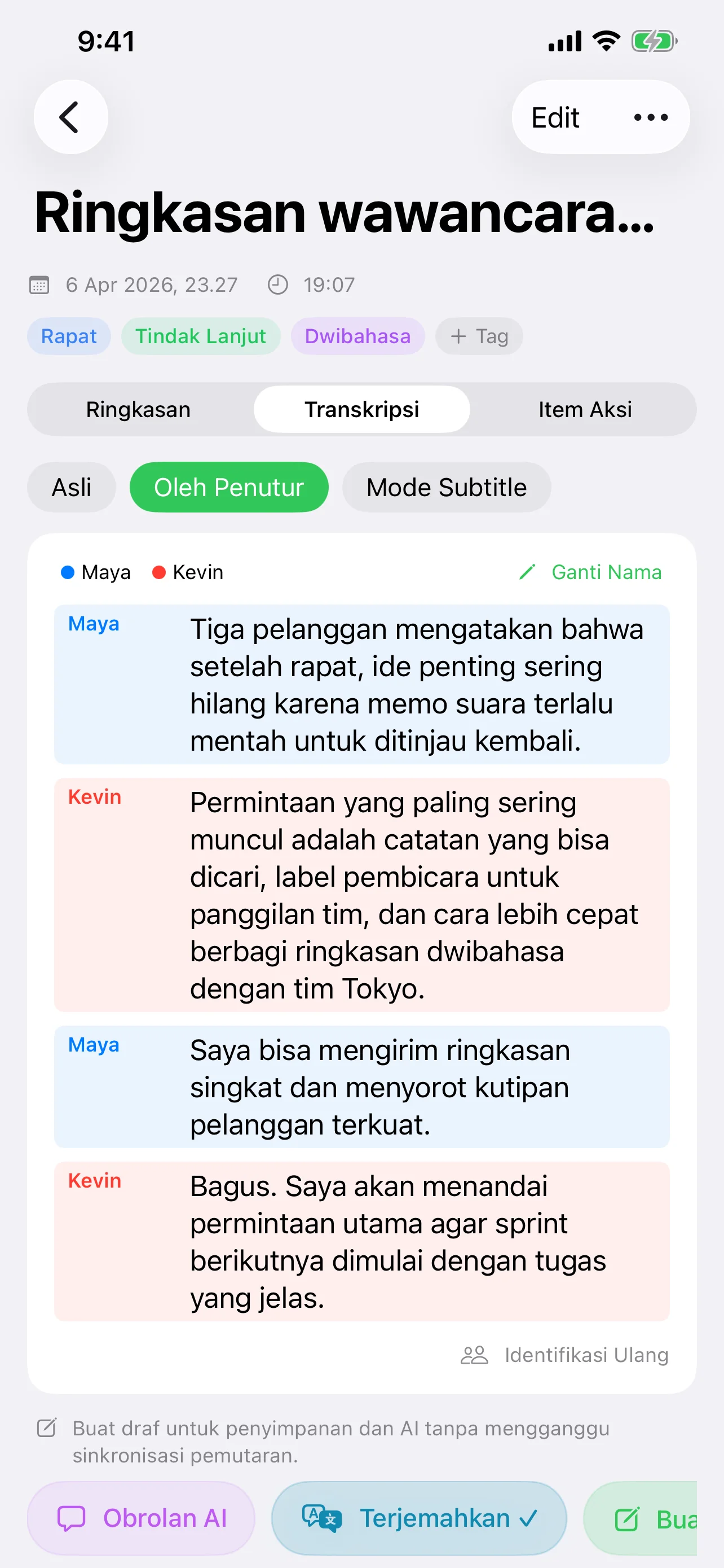 Buat transkrip, tampilan per pembicara, mode subtitle, ringkasan AI, dan item tindakan tanpa meninggalkan catatan.