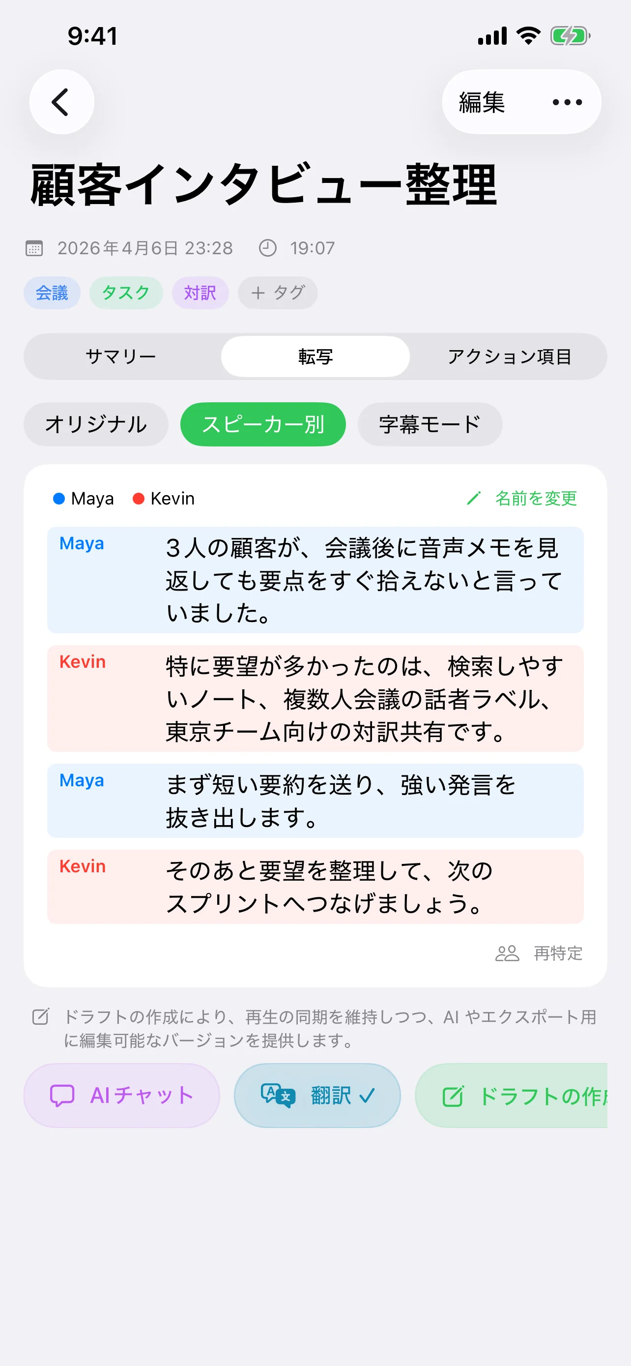 文字起こし、話者分離、字幕モード、AI 要約、アクション項目をノートの中でまとめて扱えます。