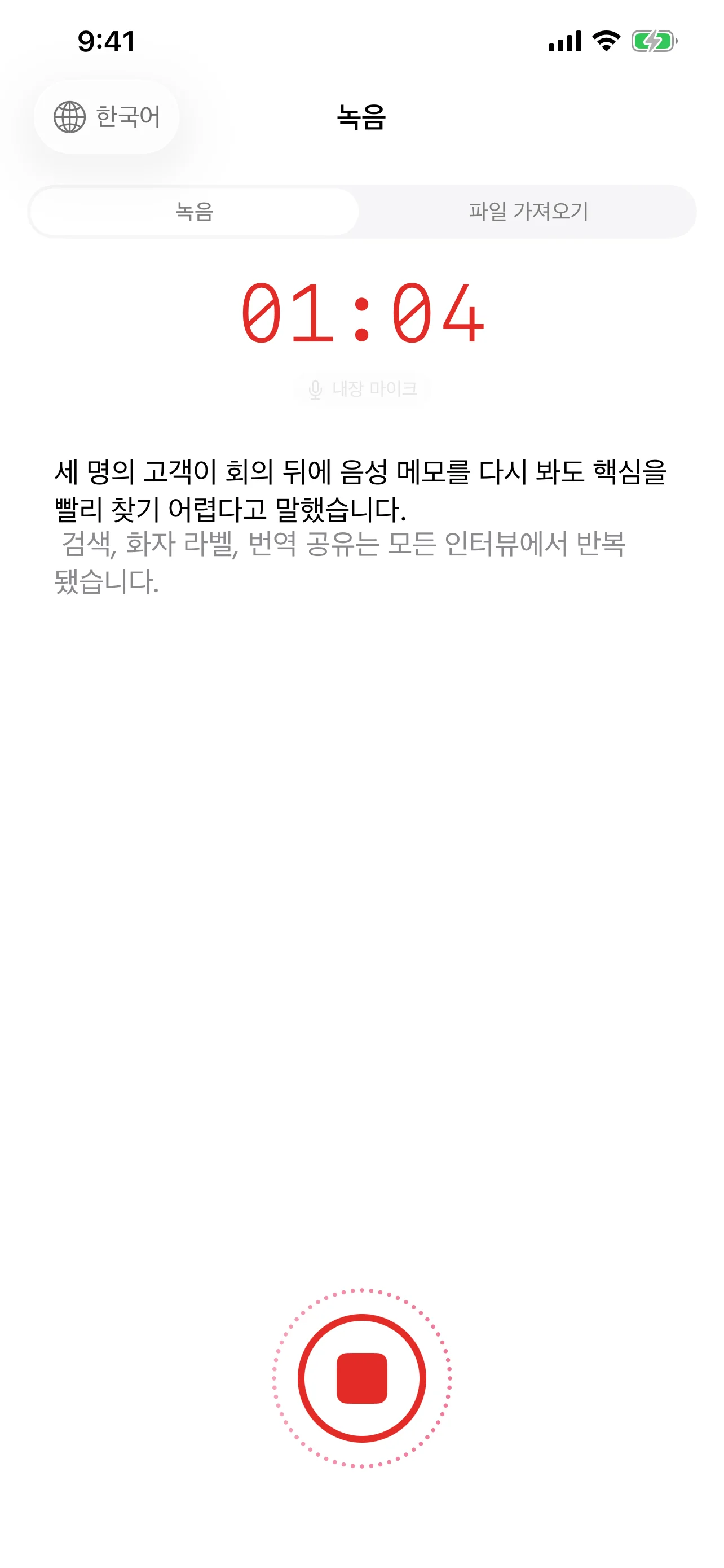 아닙니다. 실시간 녹음뿐 아니라 파일 가져오기도 지원하므로 회의 중 전사나 기존 오디오/비디오 후처리에도 쓸 수 있습니다.