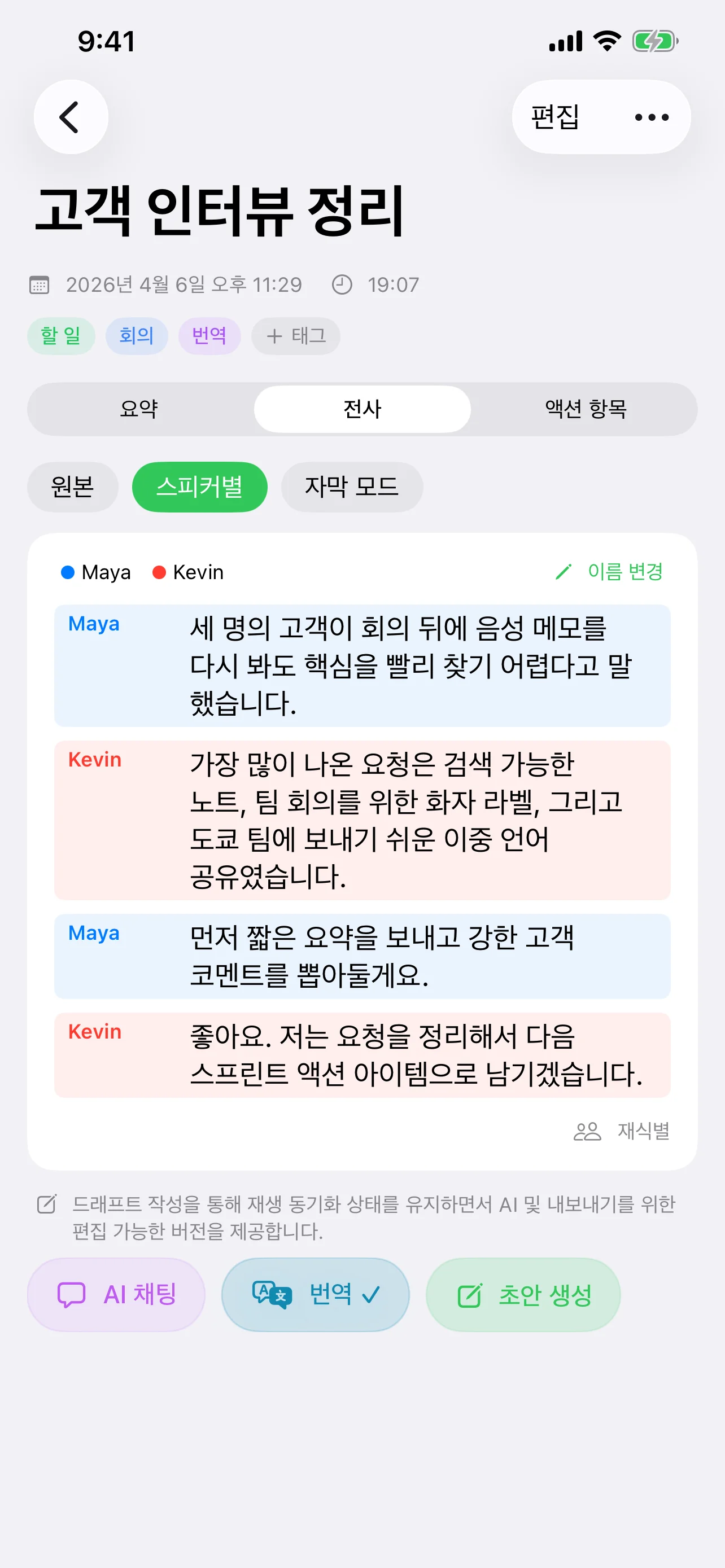 전사, 화자 분리, 자막 모드, AI 요약, 액션 아이템을 노트 안에서 한 번에 다룰 수 있습니다.