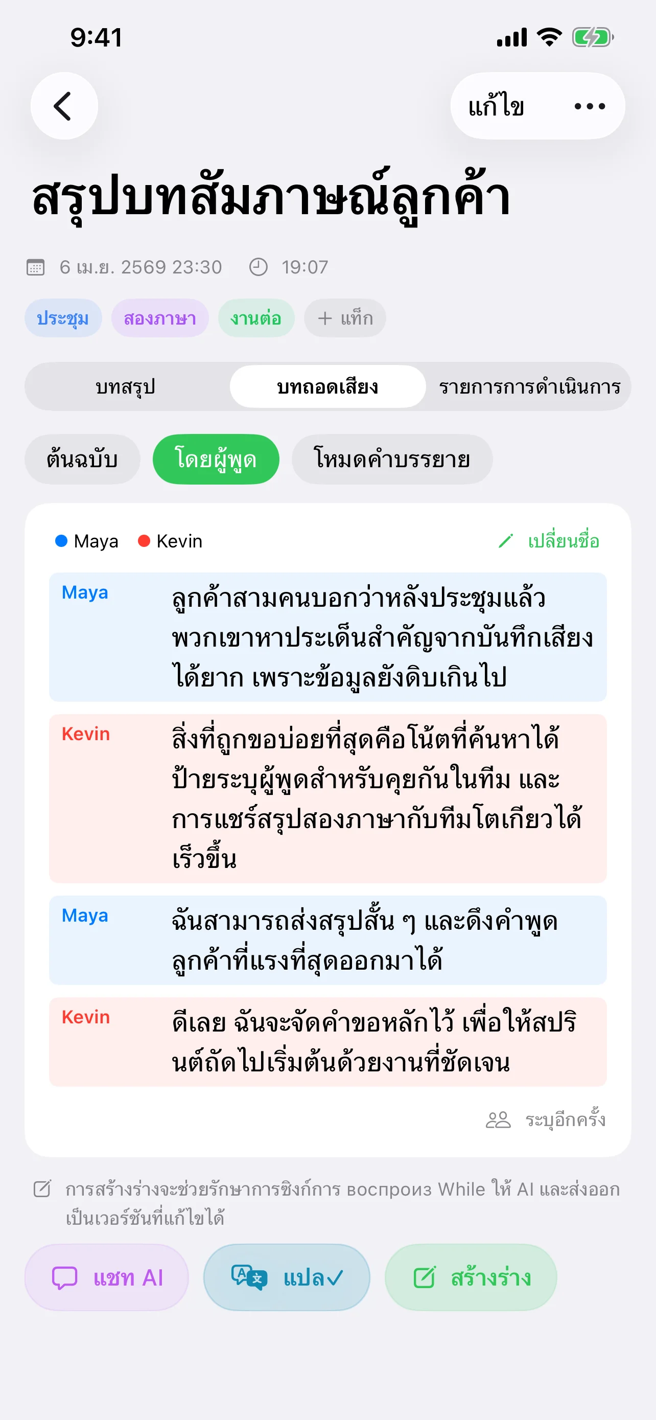 สร้างการถอดความ มุมมองแยกผู้พูด โหมดคำบรรยาย สรุปด้วย AI และรายการสิ่งที่ต้องทำโดยไม่ต้องออกจากโน้ต