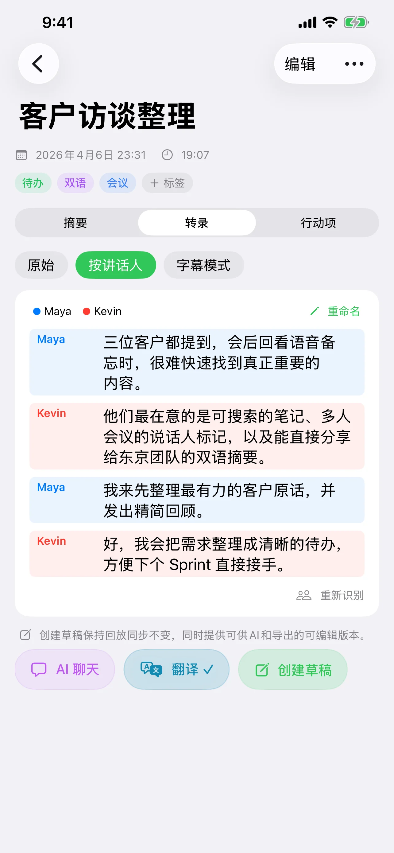 生成转写、讲话人区分、字幕模式、AI 摘要和行动项,不必跳出当前笔记。